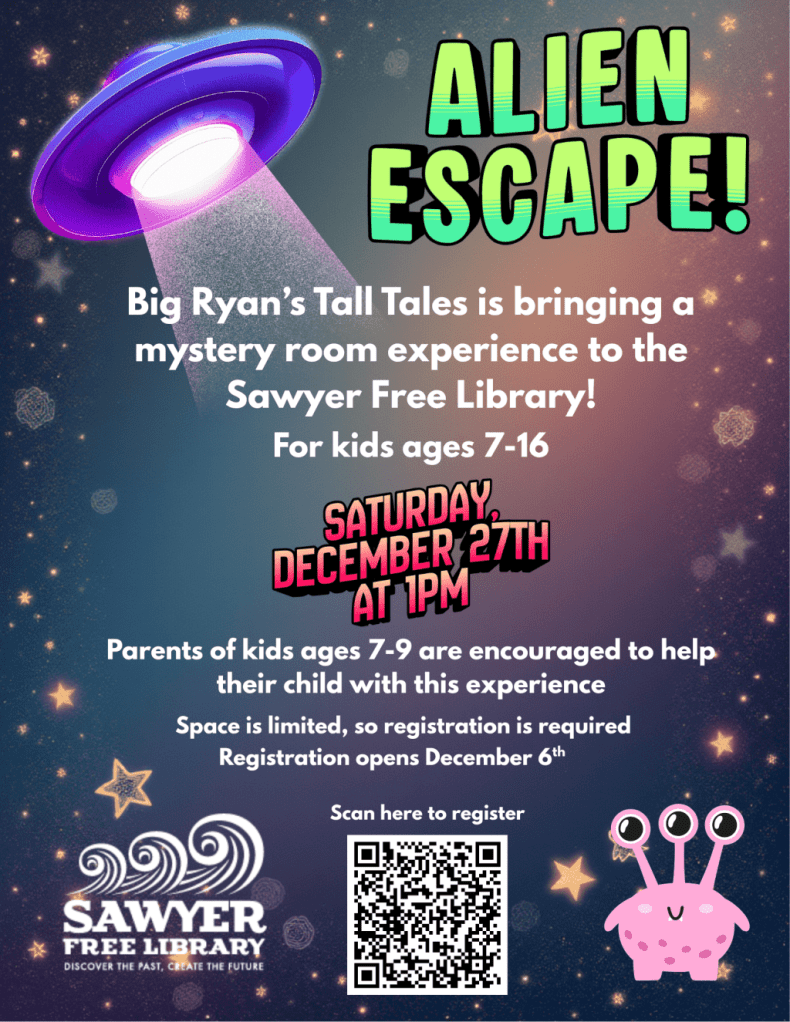 The Sawyer Free Library is calling all young detectives and adventure-seekers! Kids ages 7–16 are invited to join Big Ryan for an exciting Traveling Mystery Room experience — an interactive adventure filled with teamwork, creativity, and fast-paced problem-solving.