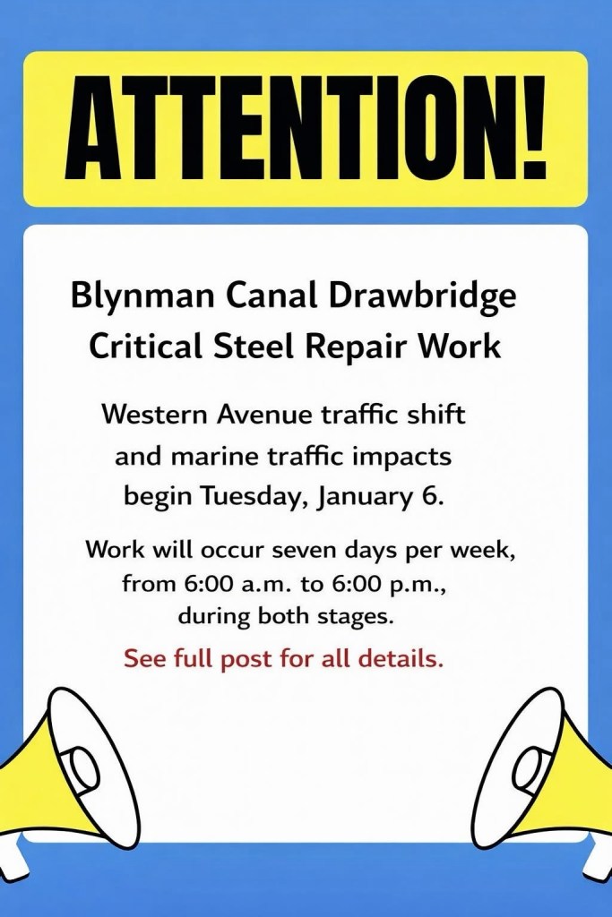➡️ Stage one will begin the night of Tuesday, January 6, with a work zone established on the westbound side of the bridge. Pedestrians will be detoured to the eastbound sidewalk. During this stage, scheduled drawbridge openings for marine traffic are anticipated on select workdays at 6:00 a.m. and 6:00 p.m. Vessels are advised to coordinate crossings at these times with the bridge operator at least 24 hours in advance.