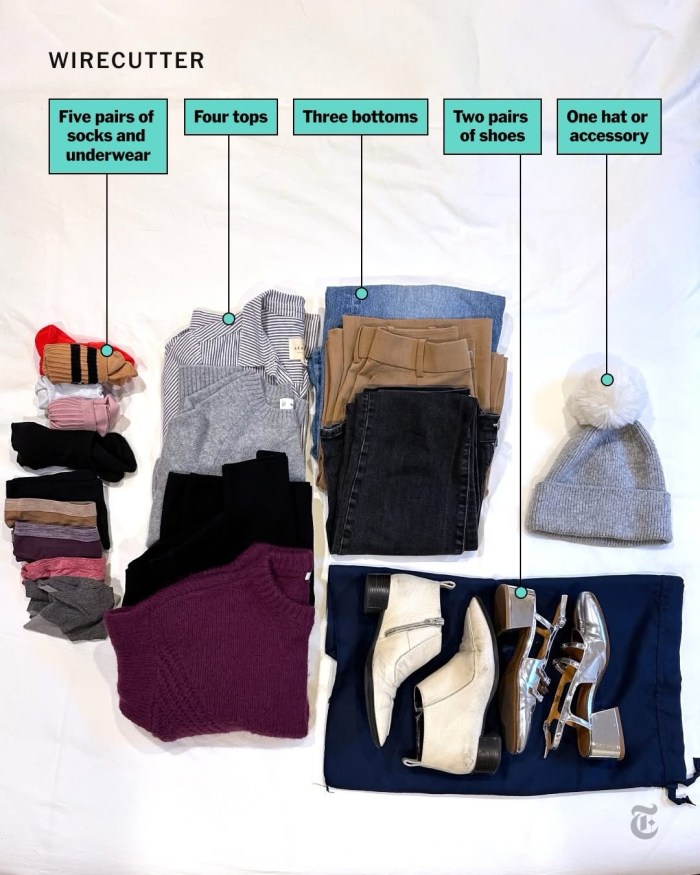 Begging to differ, New York Times and whomever came up with these packing numbers…..Here you see an example of how many of what kinds of items to pack for a one week trip in accordance with a 5-4-3-2-1 plan. I kind of agree with the ratios, but not the actual numbers. For a one week trip, I am packing AT LEAST 8 pairs of underwear. (* I am guessing I am not the only woman who packs extra underwear for “just in case” even though I have literally never needed it*) Five pairs for a week? That’s not my style and I’m guessing many of you agree. The tops and bottoms/pants I can live with but I’m probably only packing one additional pair to shoes to the ones I am wearing. The extra underwear can take over the space the second pair of shoes takes up in the luggage. Not putting one of Joey’s poms in the suitcase either…I am wearing it proudly. What do you think of these suggestions for a week’s trip?