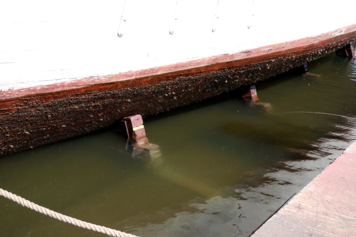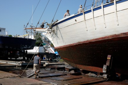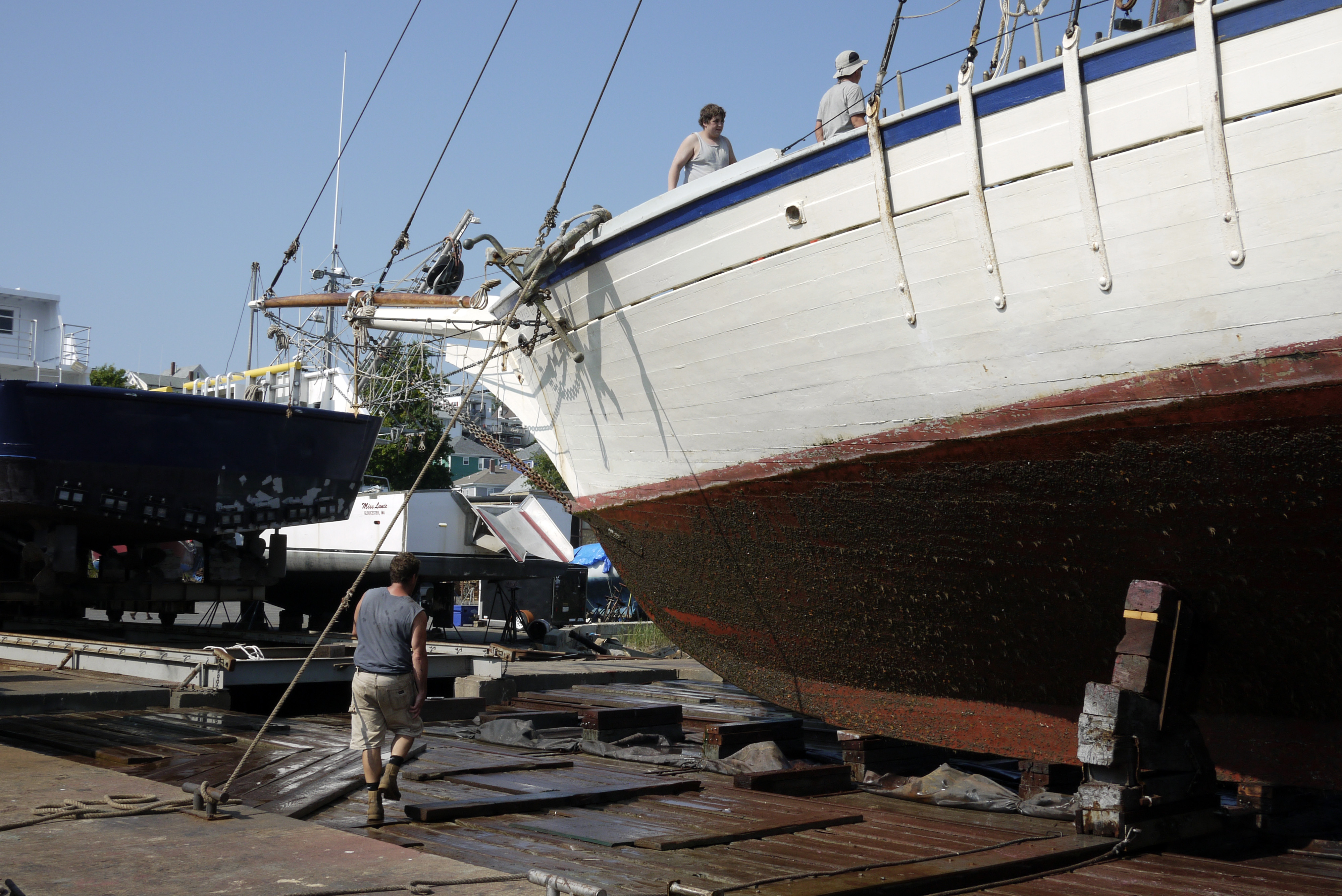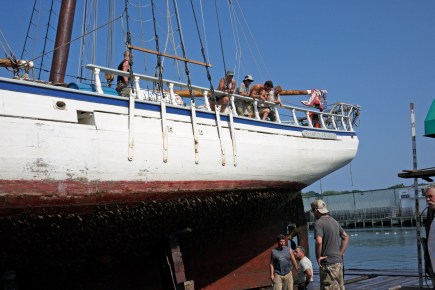 The 131 foot, 95 ton schooner Harvey Gamage is in town for this weekend’s Schooner Festival. On Tuesday afternoon it was moved from its berth at the State Fish Pier to Rose’s Marine where it was positioned, secured and lifted on the yard’s drydock for bottom cleaning and maintenance. The operation took more than an hour and involved both mechanical and hydraulic devices as well as a good deal of plain old muscle power.