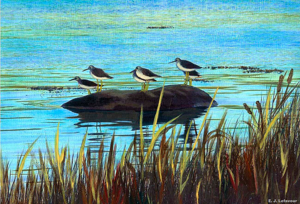 That Greater Yellowlegs, a large sandpiper, breed in muskeg bogs in the northern boreal forest? Their wintering and migration habitats are more general; they can be found in many fresh and saltwater wetland habitats, including open marshes, mudflats, estuaries, open beaches, lakeshores, and riverbanks. In comparison to Lesser Yellowlegs, Greaters are typically found in more open areas, on larger bodies of water, and on more extensive mudflats. Although the Greater Yellowlegs is common and widespread, its low densities and tendency to breed in inhospitable, mosquito-ridden muskegs make it one of the least-studied shorebirds on the continent. A group of yellowlegs are collectively known as an "incontinence" of yellowlegs. This painting is of an incontinence of yellowlegs on a rock at Goose Cove.