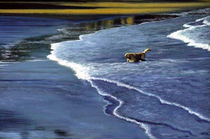 This is an artistic portrayal of our fearless top dog GMG leader of the pack emerging victorious from his frigid Rocky Neck plunge into the icy water – smiling with head and tail held high.