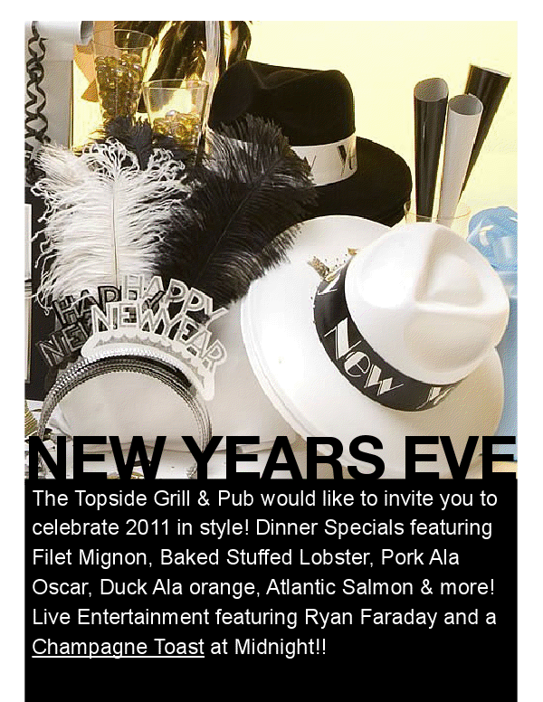 I hope you all had a great Christmas! I also want to let you all know about New Years Eve at the Topside. We will have a great dinner menu featuring Baked stuffed lobster, filet mignon, Duck Ala Orange, Fresh Atlantic Salmon, and Pork Scallopini Ala Oscar (with asparagus and lobster meat). We will also be ringing in the New Year with entertainment from Ryan Faraday and will also have a complimentary Champagne Toast at midnight!! See you there…