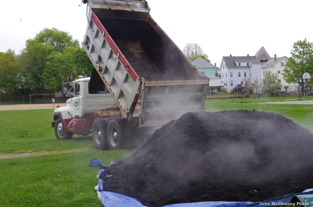 A truck dumps steaming compost for the community garden at Burnham’s Field. It took 25 volunteers about 2 ½ hours to shovel the compost into 4 x 8’ frames for individual garden plots. Twenty plots are planned.