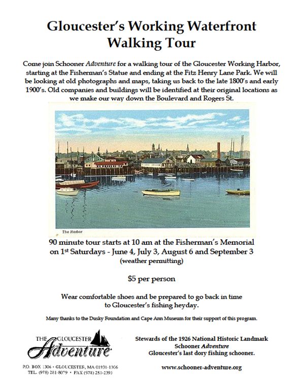 Come join Schooner Adventure for a walking tour of the Gloucester working harbor, starting at the Fisherman’s Statue and ending at the Fitz Henry Lane Park. We will be looking at old photographs and maps, taking us back to the late 1800’s and early 1900’s. Old companies and buildings will be identified at their original locations as we make our way down the Boulevard and Rogers St. Tour lasts about 90 minutes. $5 per person. For more info call Schooner Adventure – 978-281-8079 or email bwelin@schooner-adventure.org