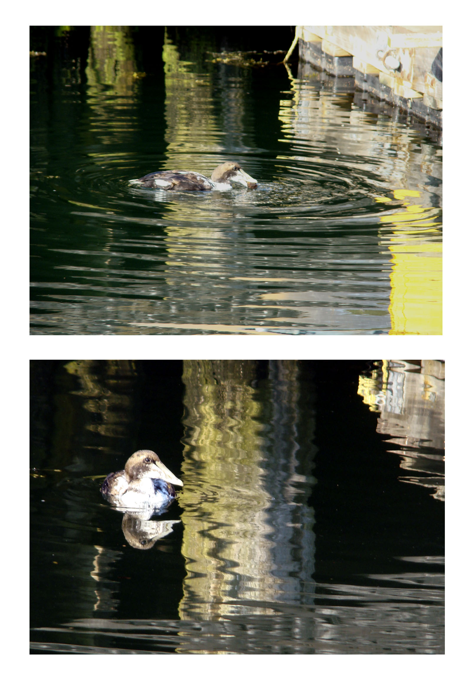 That this is an adult male common eider in eclipse plumage? Male eiders are very handsome sea ducks, who exhibit strong sexual dimorphism to attract females, so when I saw this mangy looking fellow feasting on a mollusk beside Capt. Joe & Sons, I didn’t know what it was. In the non-breeding season, they moult into this drab female-like appearance, which is called the eclipse plumage. When they shed feathers to go into eclipse, the ducks become flightless for a short period of time. Some duck species remain in eclipse for one to three months in the summer, while others retain the cryptic plumage until the next spring when they undergo another moult to return to their breeding plumage.