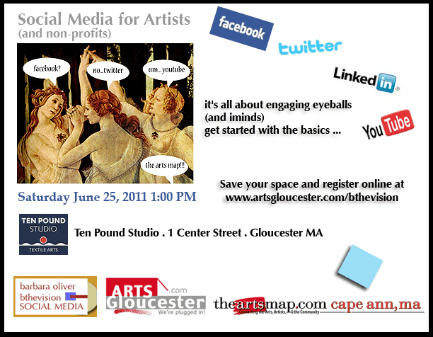 Whether you are a novice or a little further along, you can learn something of value at “Social media for Artists and Non-profits” (and small biz too!) to be held at Ten Pound Studio, 1 Center St., Gloucester on Saturday, June 25, from 1 to 4 p.m. Bring a laptop if you have one (wifi available). Register at http://artsgloucester.com/bthevision/