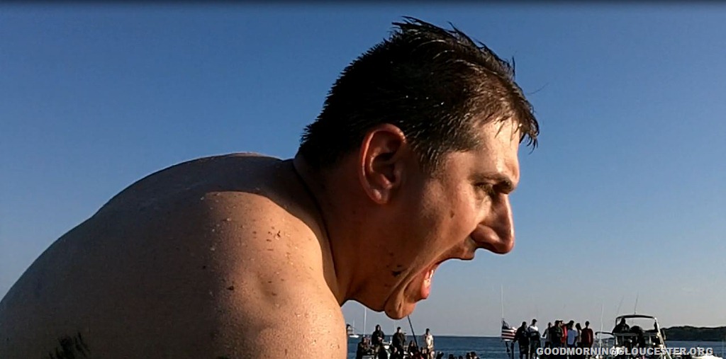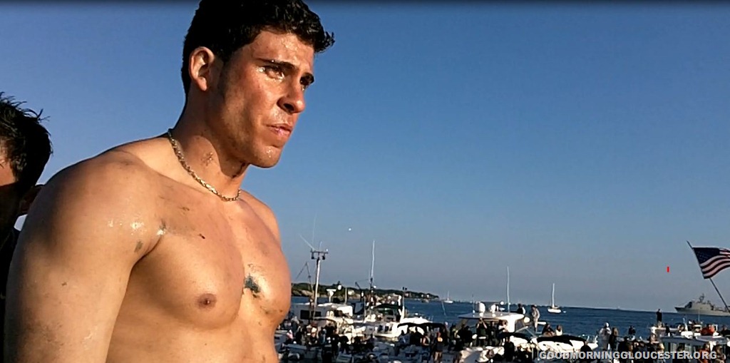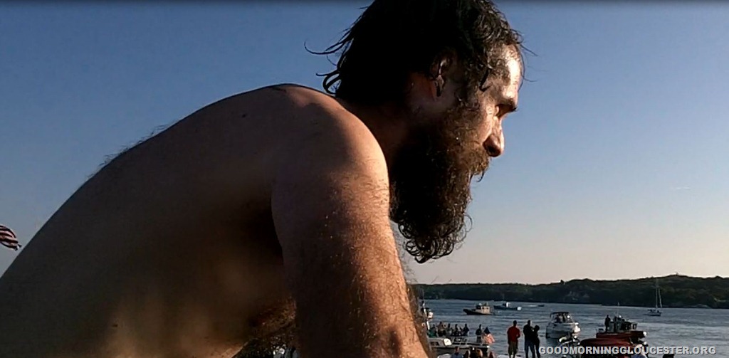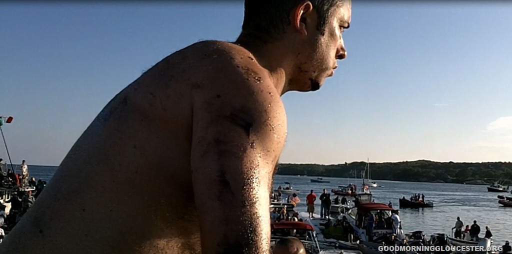 The Bean up on my shoulders at the PACKED Pavilion Beach yells out “Good Morning Gloucester!” And she is pointing front and center to the edge of the water directly in front of the Greasy pole. It was none other than Craig with his Mack-Daddy Camera with “Da Sticka” plastered on it’s side.