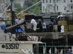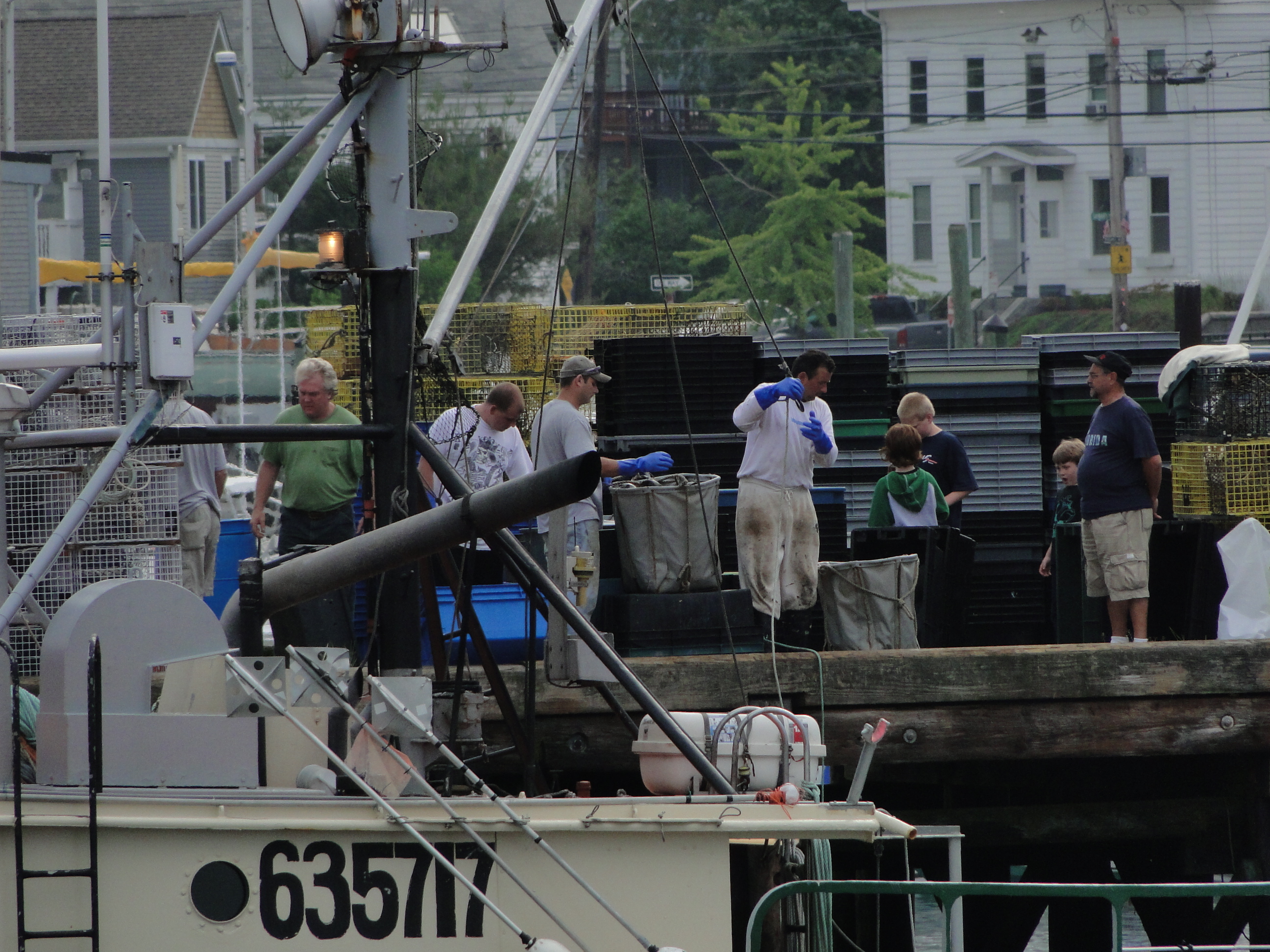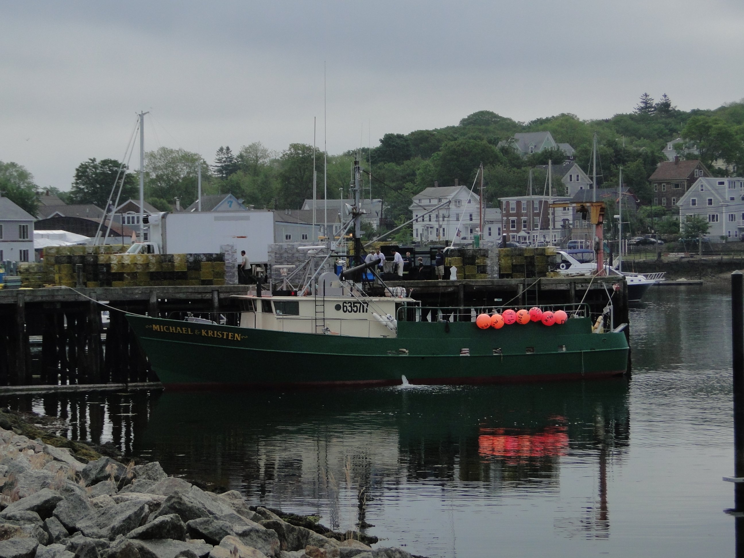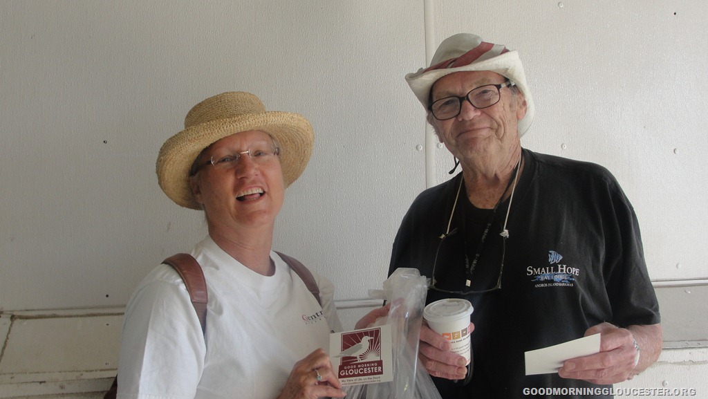 That the monkey bread miraculously made it intact from Rockport to Mug Up at Rocky Neck this morning? Here you see the proof with Paul Morrison holding up the prize (thank you Paul for your generous and delicious offering). Ed Collard took his rightful place at the head of the table, right beside the super special Lattof Farm monkey bread. Youngest mug uppers this morning were wharf neighbors Dahlia (3 months old, being held by newest Madfish Wharf artist, Gigi Mederos) and Lily, with their mom Violet. R. Duck was in attendance, but on a tight leash because she has been wandering a bit too much lately and went missing for 4 days. Greg Bover made the long journey back from Harvard Yard to join us, and Pete and Joyce Chamberlain were in the house, along with Stevie and some new visitors to the Neck. Finally, Gloucesterites, Kelly and Kai Rich stopped in for a GMG sticka and T-shirt for Kelly to wear to the parade today. Mug Up is held every Sunday morning at 10:00 at Khan Studio and the Good Morning Gloucester Gallery, 77 Rocky Neck. Put it on your calendar and join us. Coming attractions: next Sunday there is rumor that we will again be blessed with some of Paul Morrison’s amazing smoked bluefish pate’ (amazing stuff!).