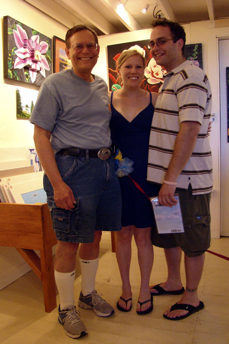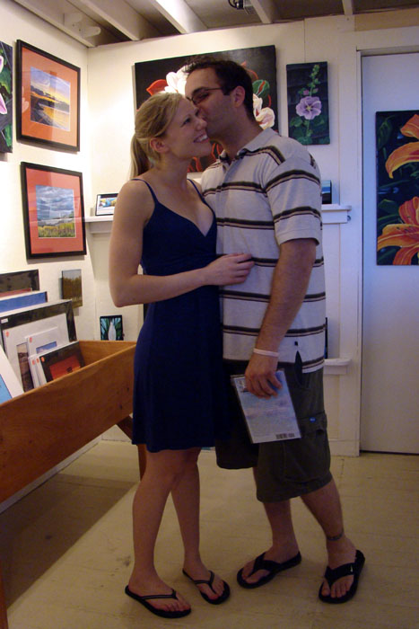 That George Tzortzis is an old-school kind of guy? He came to Rocky Neck to search out Eric Kaplan, his girlfriend Julie’s Dad, to ask his permission to marry his daughter. George had come into the gallery yesterday while he was waiting for Eric to come home and talked about his plans. He then bought a Did You Know? Book. I offered to sign it for him, but he wanted to wait until he knew the outcome of everything. Last evening Eric came in and said he had given his blessings, and it was now all up to Julie. George had set up a romantic scene at Hammond Castle, where he proposed to Julie, on bended knee, on the stairs of the castle; and Julie said yes. Today the three of them came in to share the good news, and get the book signed, which could now include congratulations to the two of them. Such a sweet couple and nice Dad/father-in-law to be, and now everyone out there in GMG land can wish them well.