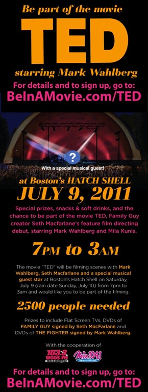 The feature film Ted starring Mark Wahlberg is seeking NON UNION volunteer extras for a concert scene shooting Saturday, July 9th