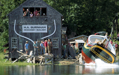 That the schooner Ardelle is ready to launch? The historic launch will take place on Saturday, July 9 at high tide, which is set at about 6:40 p.m., although the launch could happen a little sooner. If you have not witnessed an historic Essex side launch before, it is a sight to be seen!  I watched the launch of Fame on video and it was amazing to see her finally let go, hit the water sideways with a big splash, right herself and then glide gracefully like a swan across the water, as she was painstakingly built to do. The adjacent Essex shipbuilding museum will be a great viewing area. The celebration will begin at 3:00 at the Essex Shipbuilding Museum with beer, hotdogs and Woodman’s chowder and music by Michael Forney’s bluegrass band. Photo is of the Isabella launch in 2006. I can’t be there, but I hope someone can get there and capture this historic event and then share it with us on GMG.