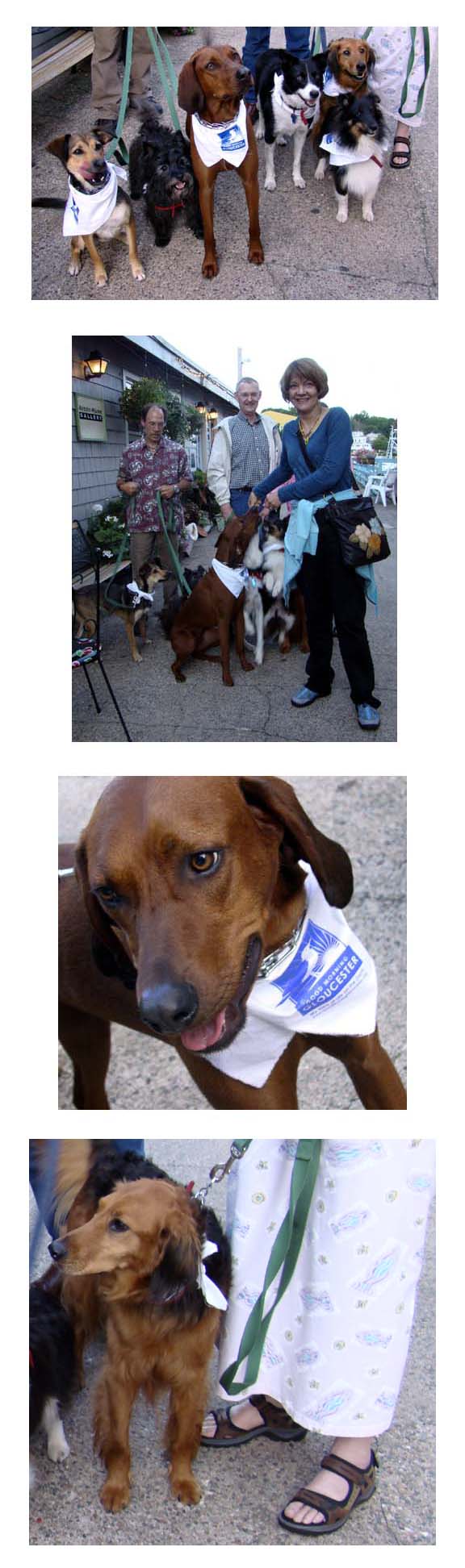 That some people will go to great lengths to get their dogs on Good Morning Gloucester? Laura and Perry Williams from Ohio have had a summer cottage in Gloucester for 30 years, and they drive here each summer with Lucy, Dylan, Jackson, Reggie, Ceamus and Angus, pictured here sporting GMG bandanas, which Laura created by scanning her GMG sticker and printing the logo onto pieces of fabric. The photo shoot was definitely going to the dogs for a while, until Laura pulled out some treats, at which point they all snapped to attention and posed so pretty. Pictured with them are Richard and Linda (unfortunately hidden behind Laura) Campbell visiting from San Antonio, TX. The bottom shot is of Linda’s dogs though – nice sandals!