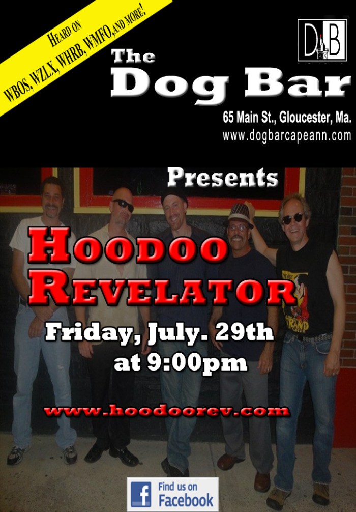 Hello everyone. Hoodoo Revelator, www.hoodoorev.com will be performing their one and only show in Gloucester at The Dog Bar, www.dogbarcapeann, 65 Main St, Gloucester, THIS FRIDAY, July 29th from 9-midnite! Our show at the Rhumbline has been rescheduled to this fall so we hope to see you all at The Dog Bar this Friday!