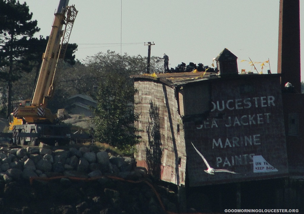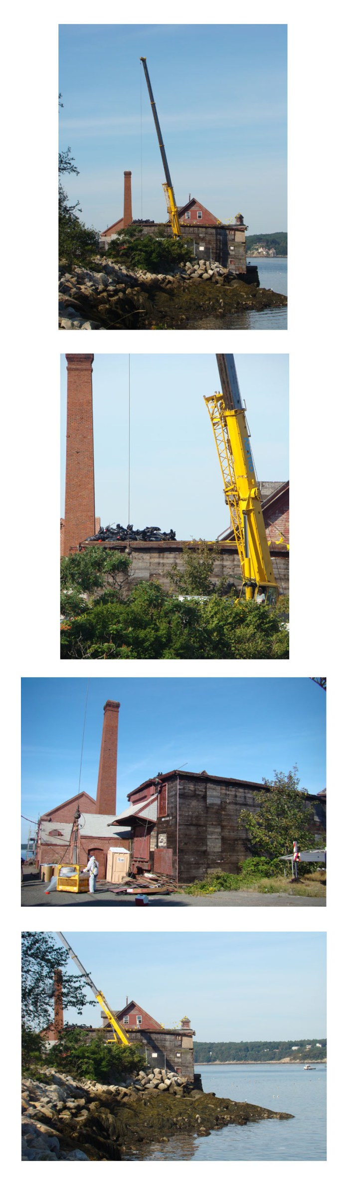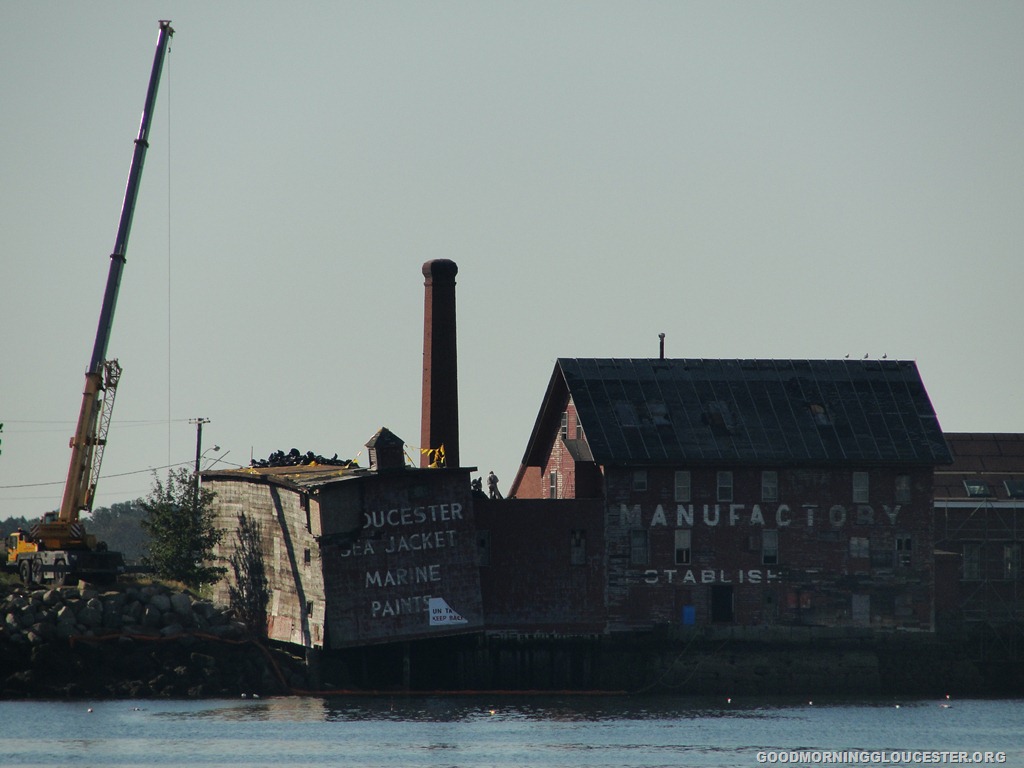 Some photos of the Paint Factory this morning with a crane and man cage being used to remove any potentially toxic materials from the roof and front (water overhanging) side of the shed of the paint factory.  I spoke with Crosby Martin of McConnell Enterprises, the dismantling and recycling company handling this portion of the project.  As you can see from the photos, this shed building section of the paint factory is in the process of falling into the harbor, so remediation is being done to make sure nothing of a toxic nature goes into the water when this building is dismantled.  All other segments of the plant from the peaked roof you can see behind the shed forward will be restored and maintained.