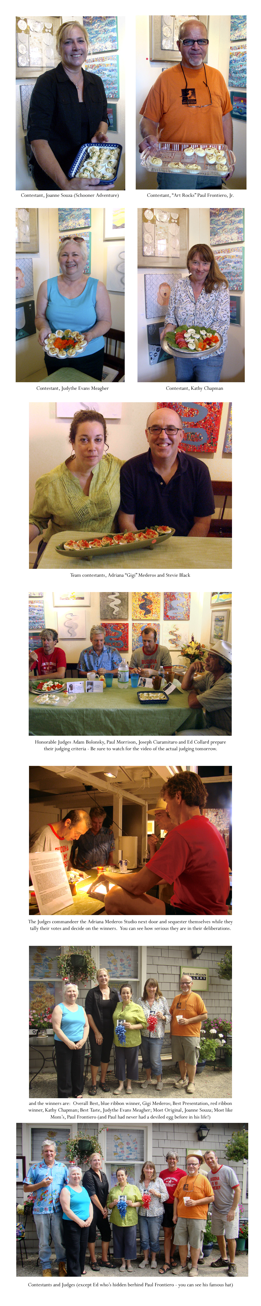 The First Annual Good Morning Gloucester Deviled Egg Competition was a huge success. Five contestants turned out with some really great deviled egg recipes and presentations. Joanne Souza of Schooner Adventure and the winner of the Most Original said: “Deviled eggs are a mainstay. Peter (Souza) loves curry so that is a main ingredient.” Paul Frontiero, winner of the Most Like Mom’s category had never eaten a deviled egg, but obviously did his research. Some of his ingredients included garlic, red wine vinegar, miracle whip, mayo and hamburg sauce. Rocky Neck artist, Judythe Evans Meagher, winner of the Best Taste category says: “This is my mom’s old-fashioned recipe, but the decoration is mine. In truth, I don’t think there is any such thing as a bad tasting deviled egg.” Photographer and Graphic Designer, Kathy Chapman, winner of the Best Presentation Category says: “These are all vegetables from my garden – lettuce, tomatoes, nasturtiums, chives and cukes that I made pickles from.” Kathy moved to Gloucester from Boston last fall and has not looked back. Blue ribbon winners of the Best Overall Deviled Eggs, Gigi Mederos and Stevie Black made their award winning deviled eggs using farm fresh eggs supplied by Brian Linquata of Dogtown Pet Care, finely chopped red bell pepper, homemade thousand island dressing, chipotle powder, celery seed, fresh chopped basil, salt and pepper. Gigi has a trick to ensure that the eggshells are easily removed from the eggs after cooking. She removes them immediately from the cooking pot and covers them with ice, and then again after the first ice has melted. The shell then can be removed easily without sticking to the egg. Although she did not enter her deviled eggs, probably to save her husband from any accusation of impropriety, Sue Lovett did make a batch of her amazing garden fresh zuccini muffins.