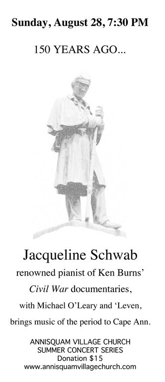 The historic Annisquam Village Church presents Jacqueline Schwab, renowned pianist of Ken Burns’ Civil War documentary series, in a program entitled “150 Years Ago….”. In observation of the sesquicentennial year since the War Between the States, Schwab performs music of period, sharing the evening with Celtic musician, Michael O’Leary and a vocal set by the women’s a capella group, ‘Leven. The Annisquam Village Church, at the head of Lobster Cove (820 Washington Street in Gloucester), is only footsteps away from a Civil War monument on Leonard Street which commemorates the lives of 19 Cape Ann men who fought in the war. Songs of the times have become part of the American song book, and will come to life under the sure hand of Schwab.