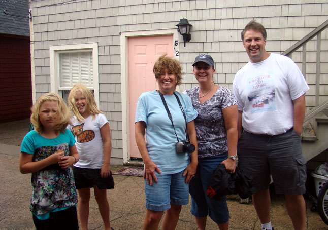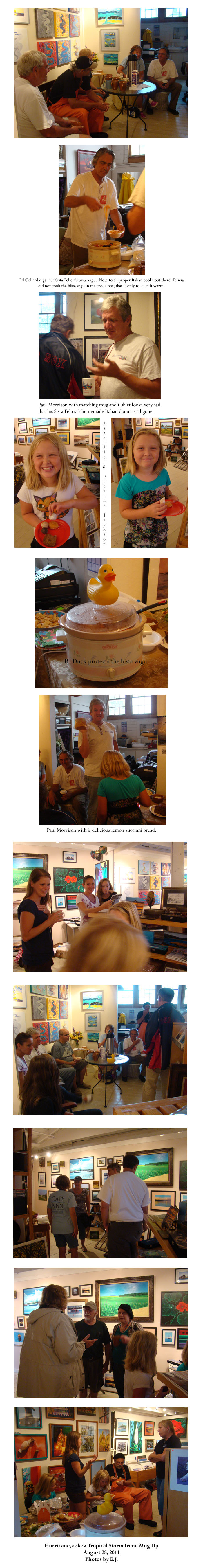In spite of the news media’s warnings of Irene’s impending doom and destruction, a bunch of hearty, hardy souls ventured out this morning for Hurricane Mug Up at Khan Studio and the Good Morning Gloucester Gallery at Madfish Wharf on Rocky Neck. It was a surprisingly large turnout considering that it was a rather nasty morning. As always, Ed Collard was the first to arrive and help get things set up. The Chamberlains, Coxs, Jacksons, Osborns and Ardizzonis were in the house. Paul Morrison journeyed all the way over from Rockport with a batch of incredible lemon zucchini bread. Peter and Joanne Souza ventured over from Schooner Adventure with some equally delicious zucchini bread. Isabelle and Breanna Jackson brought a lovely tray of deviled eggs that they made with the help of their mom, Talitha. Those girls will be contenders at next year’s Deviled Egg Competition. Guest artist, Sinikka Nogela brought some fresh fruit, and Paul Frontiero brought some Vienna Fingers (yes, Joey there are still some left and I will keep them no longer than seven days for you). Wendie Demuth stopped in with visiting friend, Chris White, a salmon and halibut fisherman from the West Coast. Joey’s sister Felicia and niece Amanda showed up with homemade donuts and a huge batch of bista zugu (spaghetti and sauce with meatballs, potatoes and hardboiled eggs), so that all present could be well fed while continuing to track Hurricane Irene strike predictions and scud to safety before things got hairy. Again, note to all proper Italian cooks out there, Felicia did not cook her delicious bista zugu in that crock pot; that was only used to keep it warm. I’d never had bista zugu before in my life, and now I’ve had it twice in the past two weeks (Felicia’s and Paul Frontiero’s) – I must be doing something right!