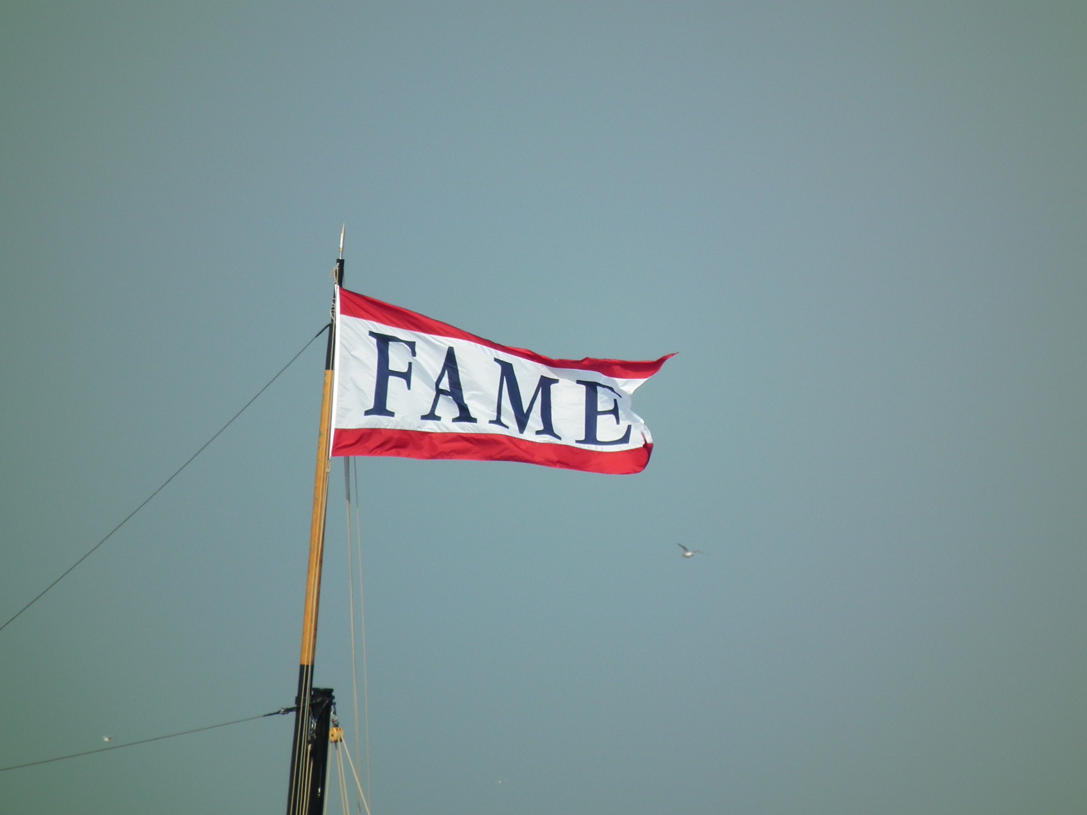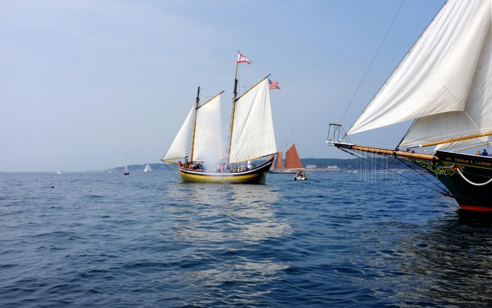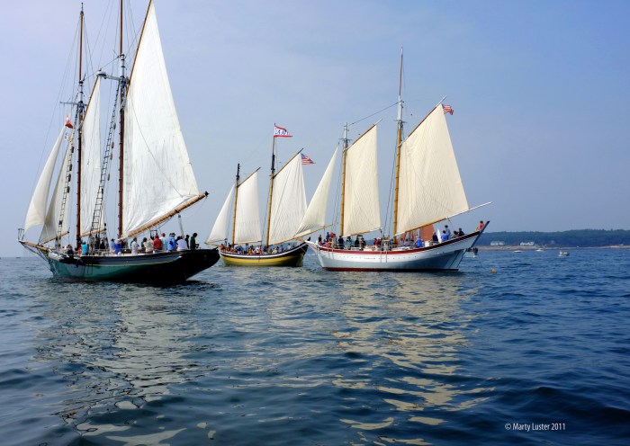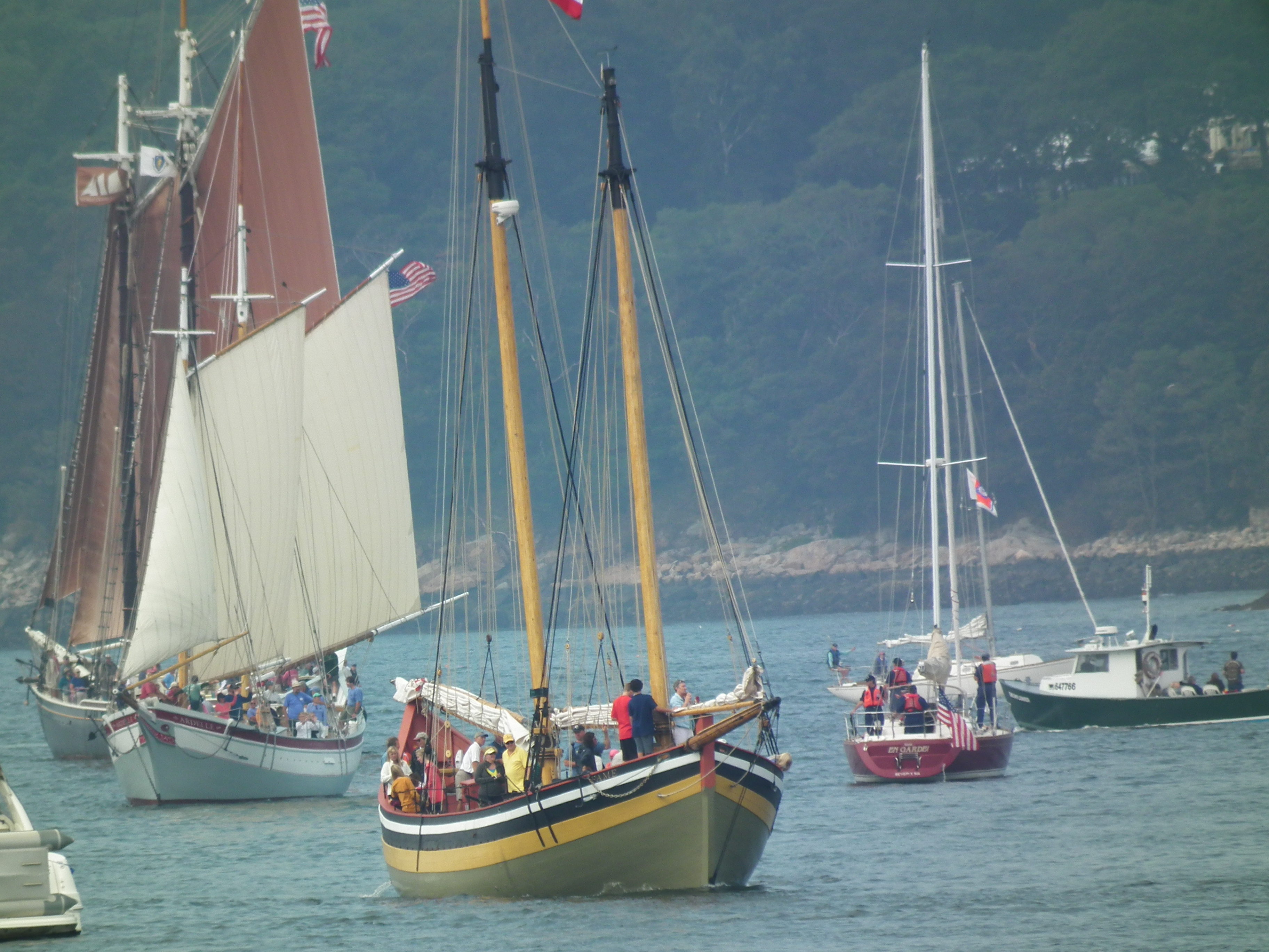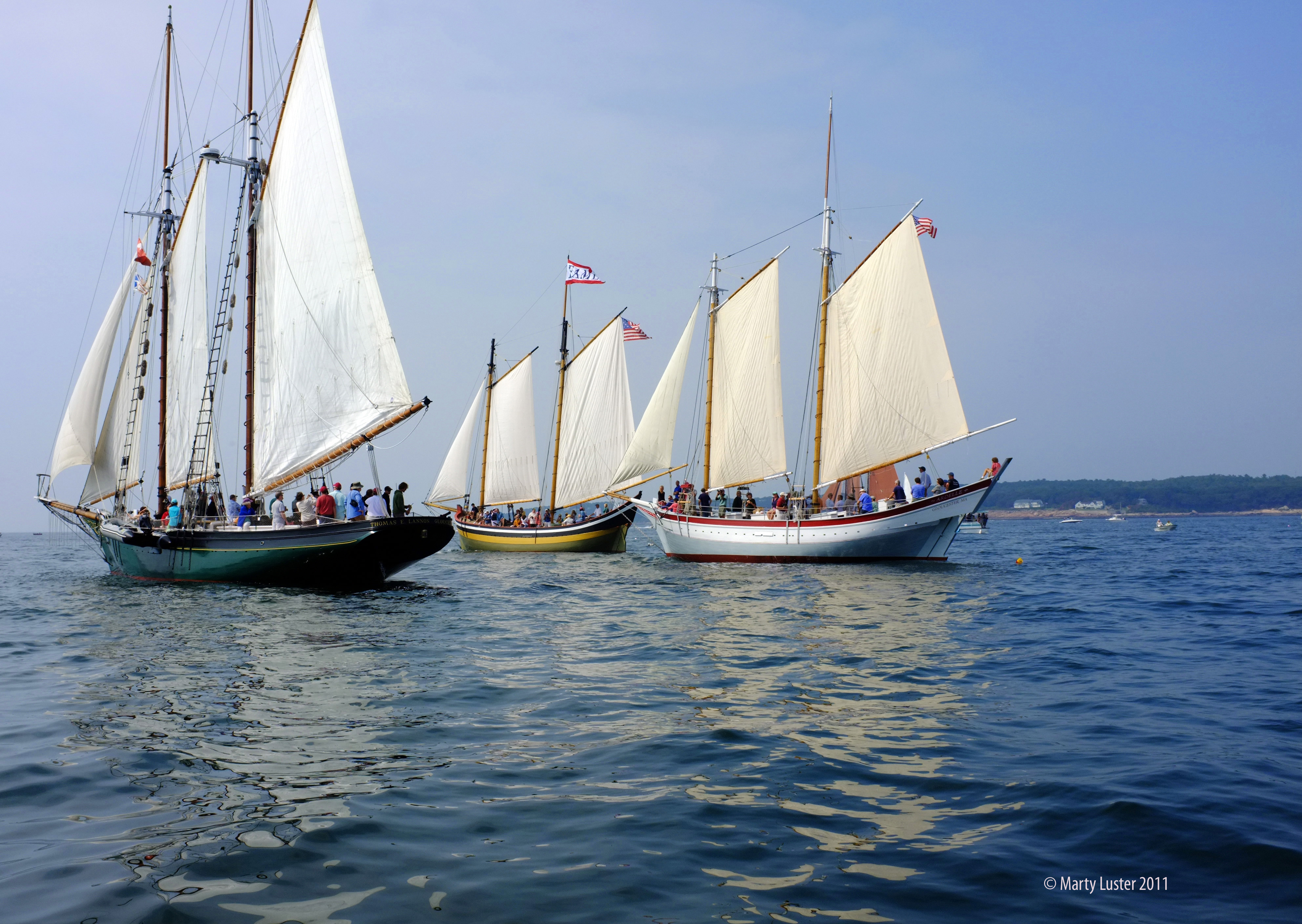 The three Harold Burnham built schooners, Thomas E.Lannon, Fame and Ardelle, gather off Eastern Point to pay respect to the late Gloucester author and historian Joe Garland prior to the start of Sunday’s races.