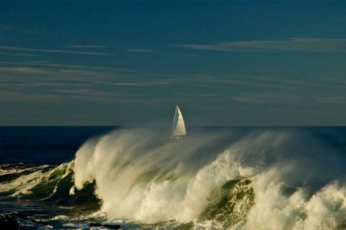 It looks dangerous for the boat but not at all. They were tacking expertly back and forth off Andrews Point. Even within a hundred yards of the point they are in a soft offshore breeze and in 120 feet of water so they barely see the bump of the surge as it passes under the boat. Amazing how that long wave just jumps out of the water in the shallows. The zoom lens stacks up the distance a tad too.