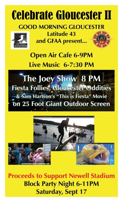 We will unveil the 25 foot screen that Ed Collard and I conceived and Ed mostly built with help from Sista Felicia and screen Sam Hartson’s “This Is Fiesta” movie- outside hoisted high up on the pilings in front of Lat 43, show footage of the blue lobsters albino lobsters, golden sea robin, Sunday Senior Seine Boat race, Friday Saturday and Sunday greasy pole footage, Monkey Balls, Craig Kimberly’s Fiesta Videos, Faces Of The Fishermen From EJ, Gloucester’s Finast Kind Calendar, and much much more. The Outdoor café setup in the parking area in front of Lat 43 will be incredibly set up Lat 43 will be practically giving the food away and there will be adult beverage service- NOT TO BE MISSED!!!!!