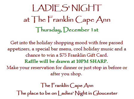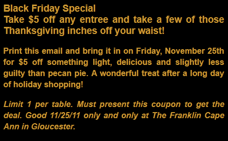 As a reminder, The Franklin Cape Ann will be closed on Thanksgiving Day to allow our staff to spend time with their families and we hope that you will enjoy your day with the people you love.