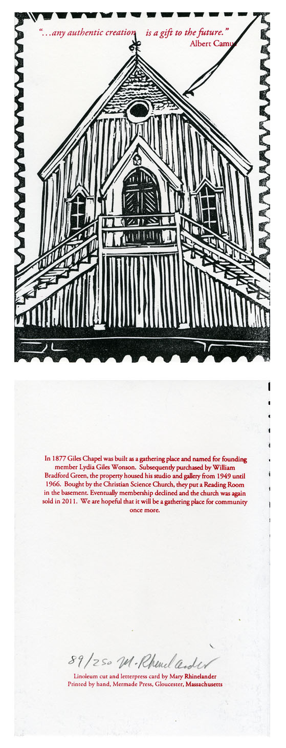 RNAC member, Mary Rhinelander, has generously created and donated 250 signed and numbered linoleum cut and letterpress cards depicting the building, with a brief history on the back. Originally built in 1877 and then known as the Giles Chapel, it was built as a gathering place for the community and named for founding member, Lydia Giles Wonson. This lovely card is available at the RNAC Winter Show, 130 Main Street, and can be yours for a donation of $5 toward this fundraising effort.