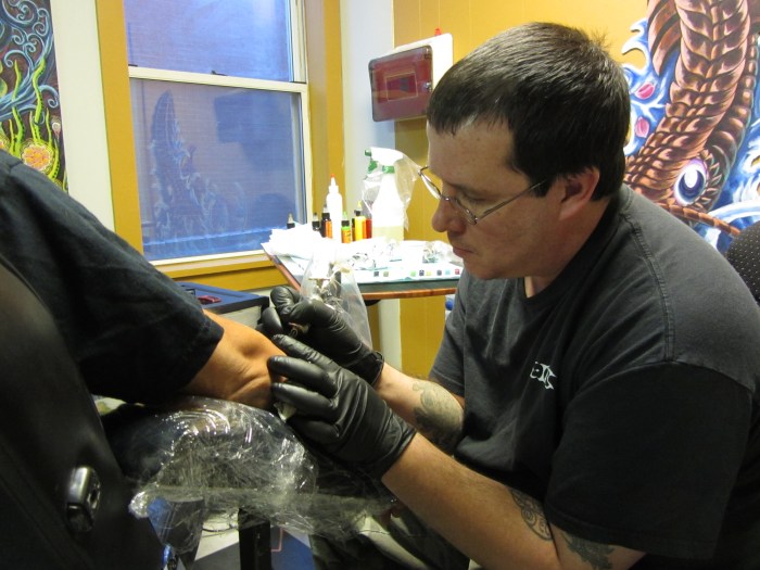Matt Maguire owns the shop and also works as an artist along with Jon Saulnier. We didn’t have a chance to meet Matt, but he sounds like a pretty cool guy and a great artist. Mike worked with Jon, describing the tattoo he wanted while Jon worked his magic designing the tattoo.