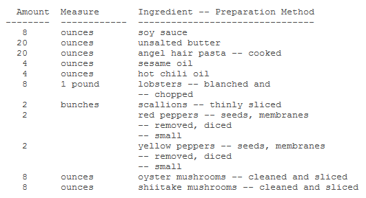 CHEF’S NOTE: You will need 8 one-pound lobsters, blanched, with all the meat removed from the shells. Chop the meat, and reserve all the head shells, legs, and tail pieces. STEP ONE: Soy Butter Sauce and Pasta– Bring soy sauce to a boil, add butter in chunks, stirring until all is incorporated. Set aside. Cook angel hair pasta in boiling salted water until "al dente." STEP TWO: The Lobster– Combine sesame oil with hot pepper oil (approximately 1 ounce total per portion based on the desired hotness). Stir-fry lobsters in oils after coming up to smoke stage. Add scallions, peppers, and mushrooms. Cook until "al dente." Add angel hair pasta and soy butter to mixture, toss everything together. Place on center of each plate. Arrange hot lobster shells on plates to appear as a whole lobster presentation