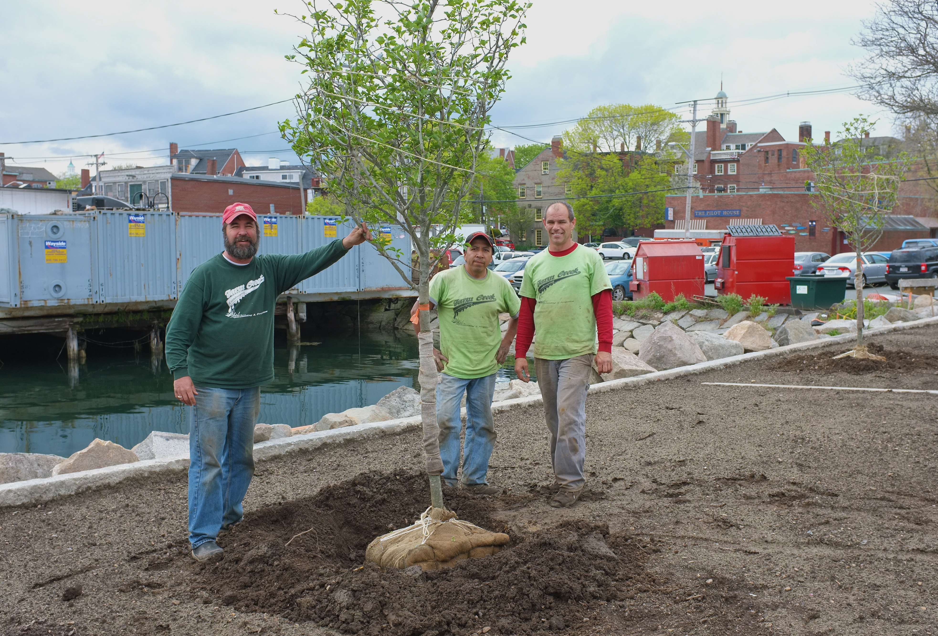 Jay Ramsey with his crew Mauriocio Tuquerres and Mike Rogers planting hawthorn Crategus viridis ‘Winter King’ at Gus Foote Park.