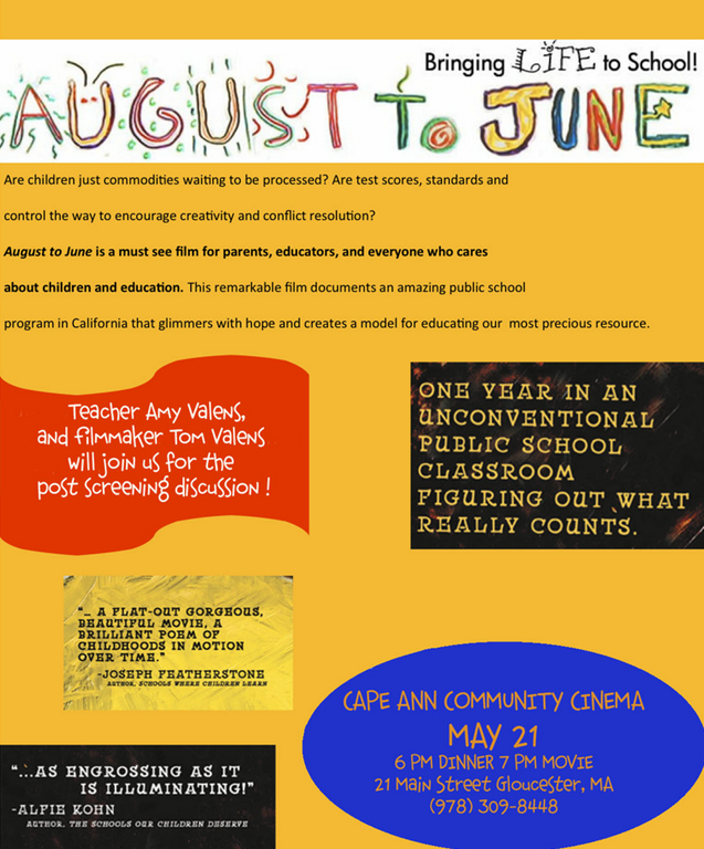 Cape Ann’s much-publicized debate over the new Gloucester Community Arts Charter School has dominated public conversation about education. This screening of AUGUST TO JUNE, as well as the conversation with filmmakers Amy and Tom Valens afterwards, gives those who care about the future of education and high stakes testing a chance to watch and discuss a positive vision for the future.
