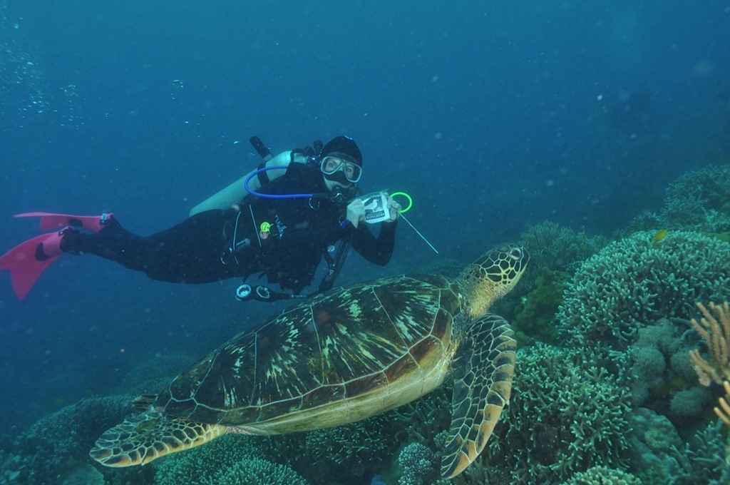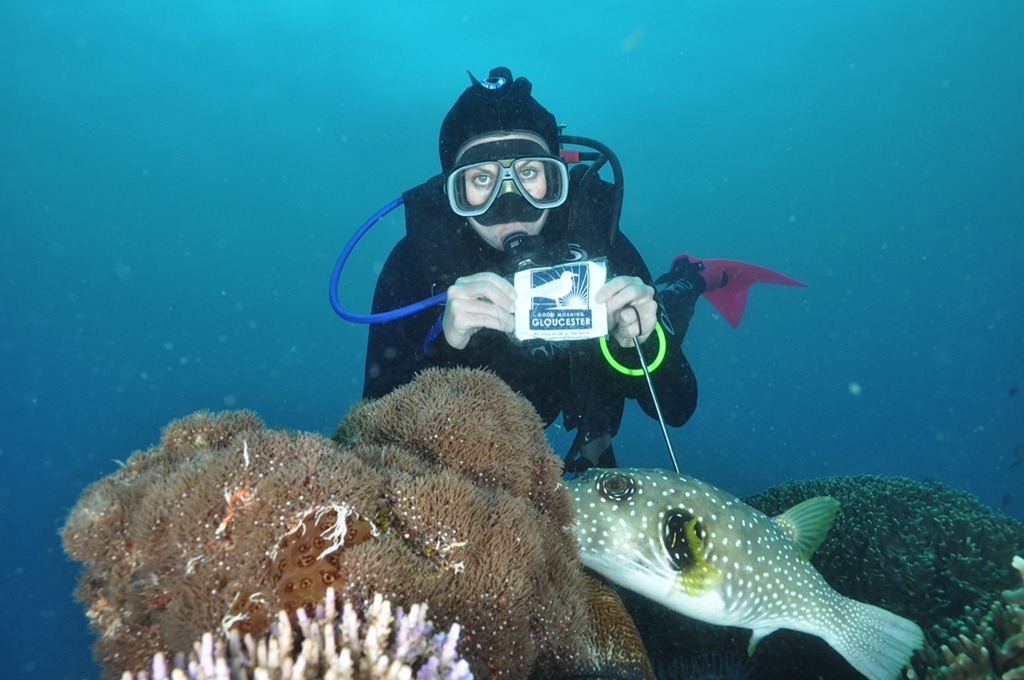 Hi Joey, Here are some photos from a recent trip to the Philippines. These were fun photos to take. I did so much diving–it was nice break to pose with the sticker instead of look at fish. But know I think I need a new sticker!!