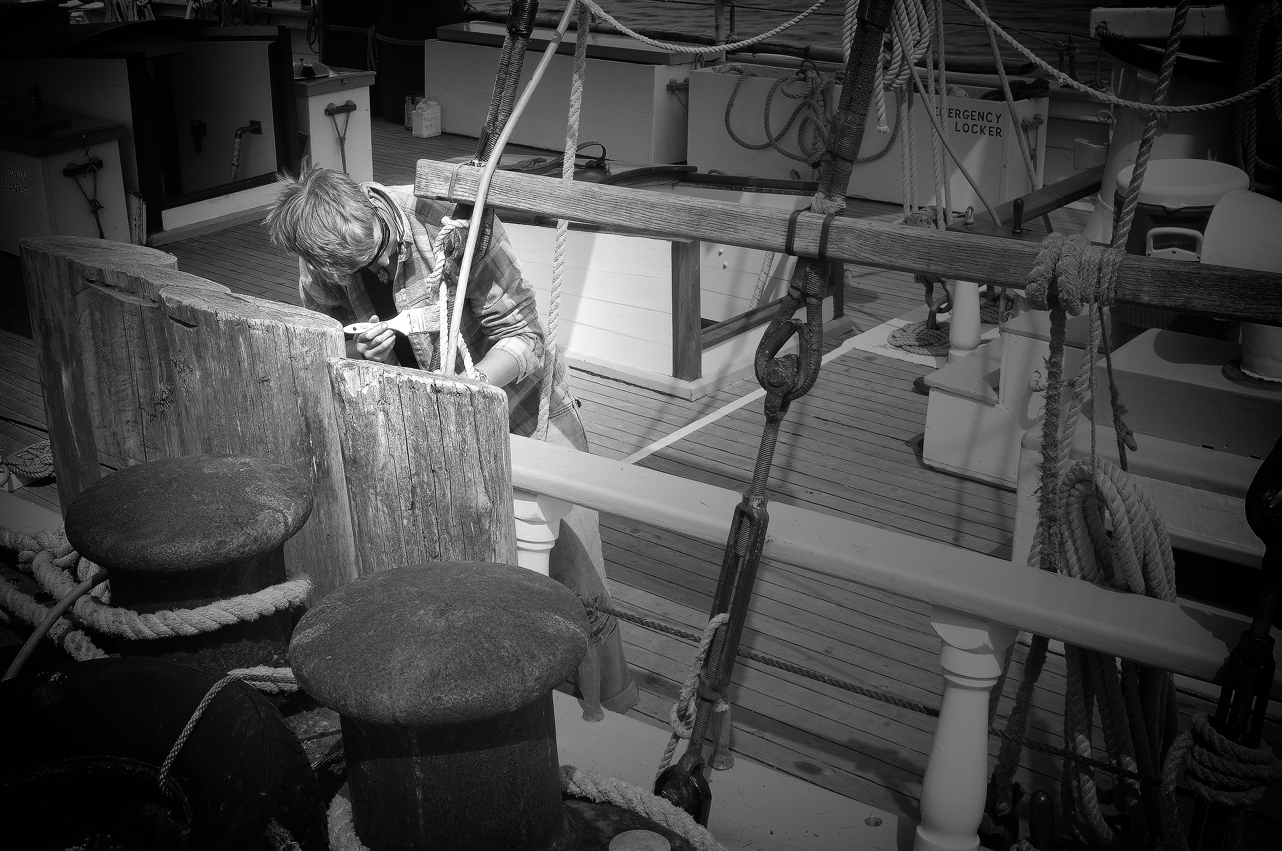 A crew member at work on the schooner Harvey Gamage, docked at the newly completed Harriet Webster Pier in Harbor Loop.