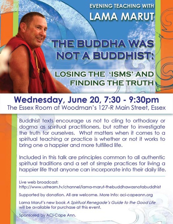 lama marut will be at woodman’s function hall next wednesday, june 20. his presentation is entitled, The Buddha was Not a Buddhist. very compelling topic dealing with how the message of a visionary, whether it be buddha, christ or someone else, becomes institutionalized (not in the sanitarium way) and how people hold on to it as the only truth as they start to separate themselves from those who don’t believe in the same things they do. you can see how this might lead to problems. lama marut’s talk will show how we can ditch the dogma and get down to the beautiful core of a spiritual practice. he loves this stuff and will most likely be on fire! you should try to come to this one, i think you’d like it! you might also find this interesting: lama marut’s inspiration and lineage