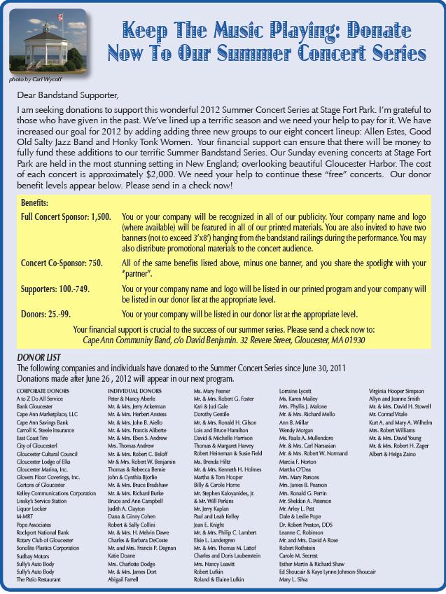 The opening concert features North Shore Acappella who became a national sensation competing in last summer’s ‘The Sing-Off, on the NBC. We welcome them and their followers back to Stage Fort Park. The concert series is funded by Corporate and Individual donations. “We had a tough goal for fundraising but our loyal audience and friends in the business community came through with most of what we needed this year. We can still use help” says Benjamin. Donations can be mailed to Cape Ann Community Band, C/o David Benjamin, 32 Revere Street, Gloucester, MA 01930. For additional information please call Benjamin at 978-281-0543