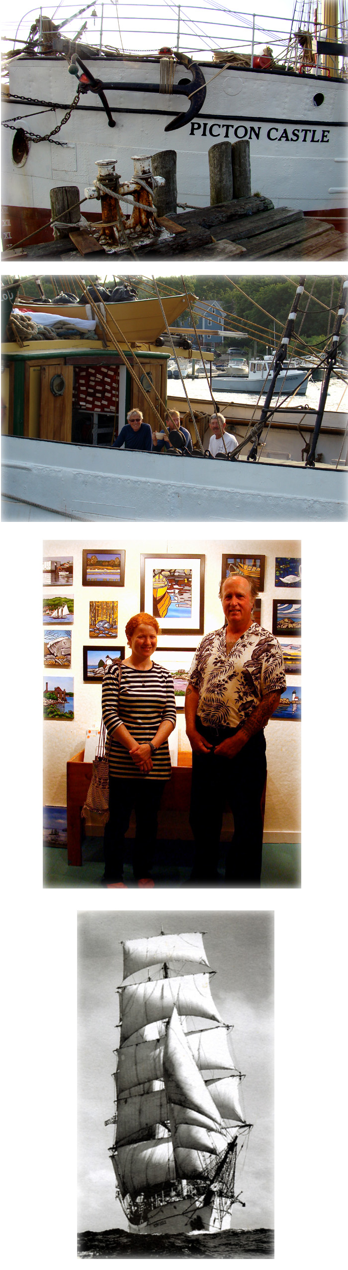 The Picton Castle is tied up at the Marine Railways and will be here until Saturday morning. She and her crew came here from Newport, RI where they took part in the Ocean State Tall Ships event. Pictured above at Khan Studio and the Good Morning Gloucester Gallery are Picton Castle purser, Kate “Bob” Addison from England, and Capt. Daniel Moreland from Nova Scotia.
