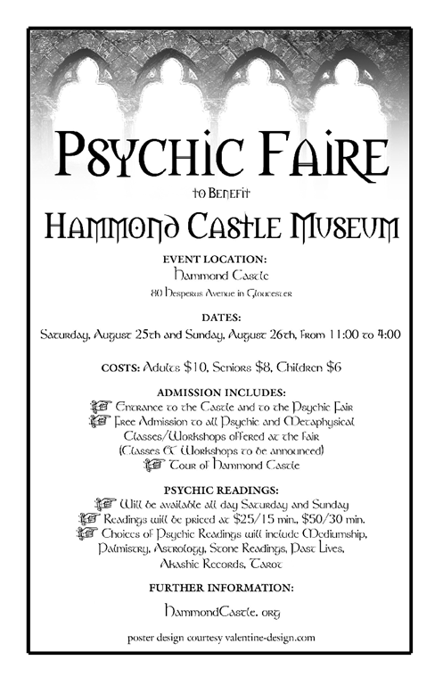 The annual Hammond Castle Psychic Faire will take place on Saturday, August 25th and Sunday, August 26th from 11:00 – 4:00. The admittance fee, $10 adults, $8 Seniors, and $6 children, includes entrance to Hammond Castle and to the Psychic Faire, as well as free admission to all psychic and metaphysical workshops, and a rare tour of the castle, led by Curator John Pettibone, which will emphasize the psychic bond shared by John Hammond and his wife.