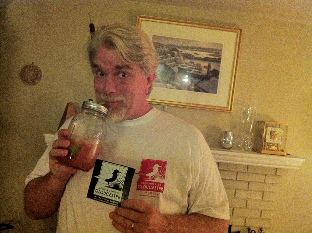 Cape Ann Giclee’s James Eves enjoying the GMG loot his wife brought home from the sidewalk bazaar! –