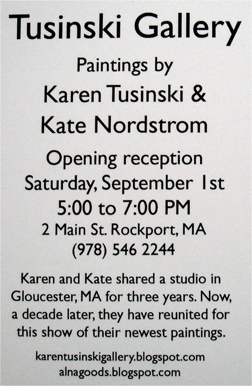 You’ve been in my gallery to see the ‘catch’ exhibit last yr, this yr., I’m featuring a guest artist to show with me –in my gallery: TUSINSKI GALLERY 2 Main St., Rockport, Ma