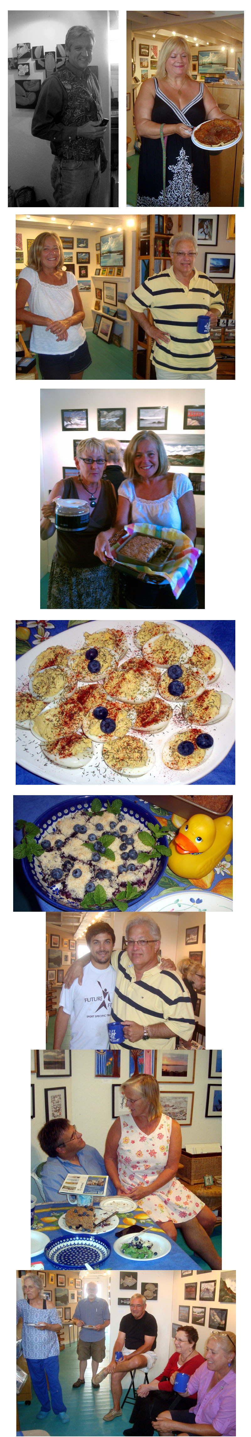 I am still reeling from blueberry and sugar overload from yesterday’s Mug Up Blueberry Bake Competition. In addition to baked entries by Deb Shradieck, Joanne Souze and Joy Kasmer, there were also blueberry crumb cake and blueberry pie donations (thanks Violet Gray), as well as blueberry deviled eggs (unexpectedly good – it was Ed Collard’s idea) and the always delicious non blueberry contribution by Paul Morrison of Latoff Farms Monkey Bread. Madfish Sushi god, Jordan Ruben’s father Greg was visiting and joined in the fun, and long time no see friends Pete and Joyce Chamberlain were in the house. Of course, H.A. Lind was there with her beautiful exhibit of new Cape Ann focused paintings, here at the gallery through August 30. If you missed her well attended opening yesterday afternoon, she will be having a meet the artist reception on Sunday, August 26th from 2:00-4:00.