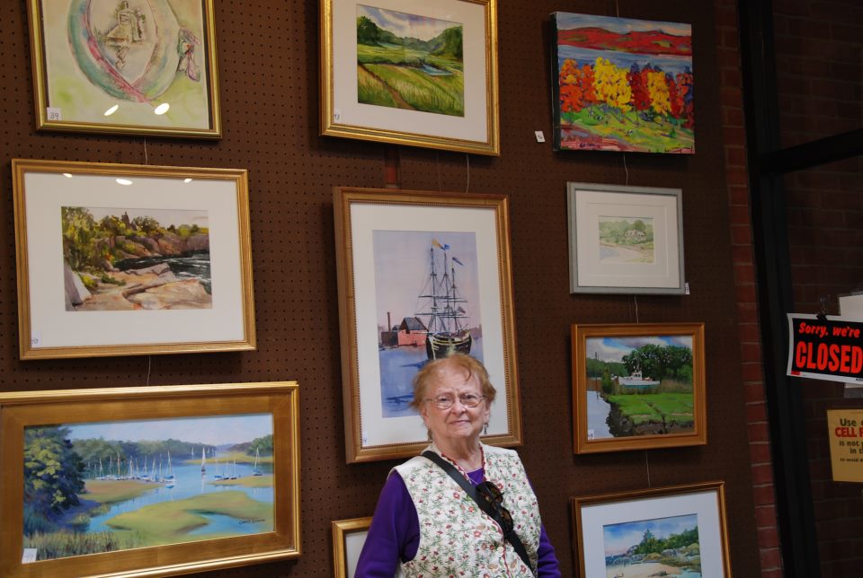 Gail Farrell standing under her painting: Essex Marsh (#43)