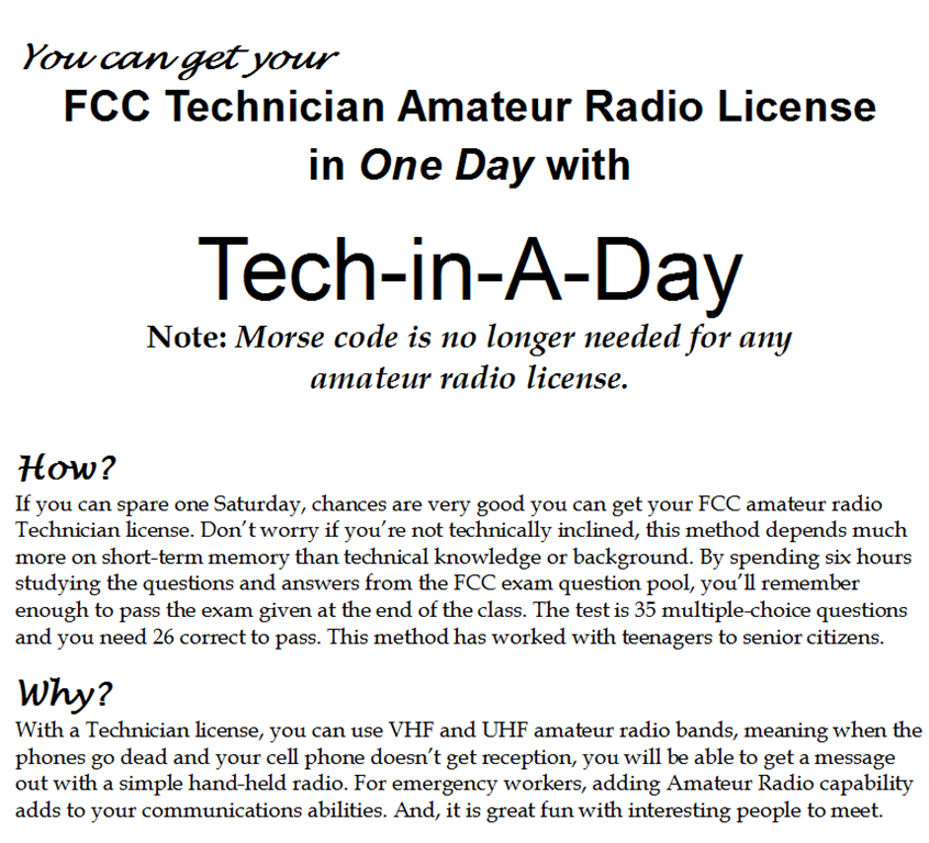 The Cape Ann Amateur Radio Association is holding a one day study course for those who are interested in earning the FCC Techncian Class Amateur Radio License.This all day self study course will be held on Saturday October 27th at the Lanesville Community Center on 8 Vulcan Street in Gloucester.The course will start at 8:30 AM and will go to 4:00 PM when the students will take the license exam.There is a $20.00 per student fee which includes,study materials,snacks and the FCC test fee.Those interested may sign up beforehand by contacting course leader Stan Stone at techinaday@caara.net . Did you know that there are over 700,000 amateur radio operators in the United States and that ham radio saves lives? To learn more about the worldwide amateur radio hobby please go to www.caara.net .