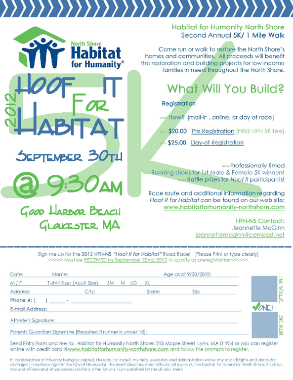 I volunteer for Habitat for Humanity of the North Shore. We mergered with the Cape Ann chapter last year and service the Northshore from Rockport to Saugus. We are hosting our 2nd Annual Hoof it Habitat 5K run, 1 mile walk along the beautiful back-shore of Gloucester (Atlantic Road)on Septemeber 30th.