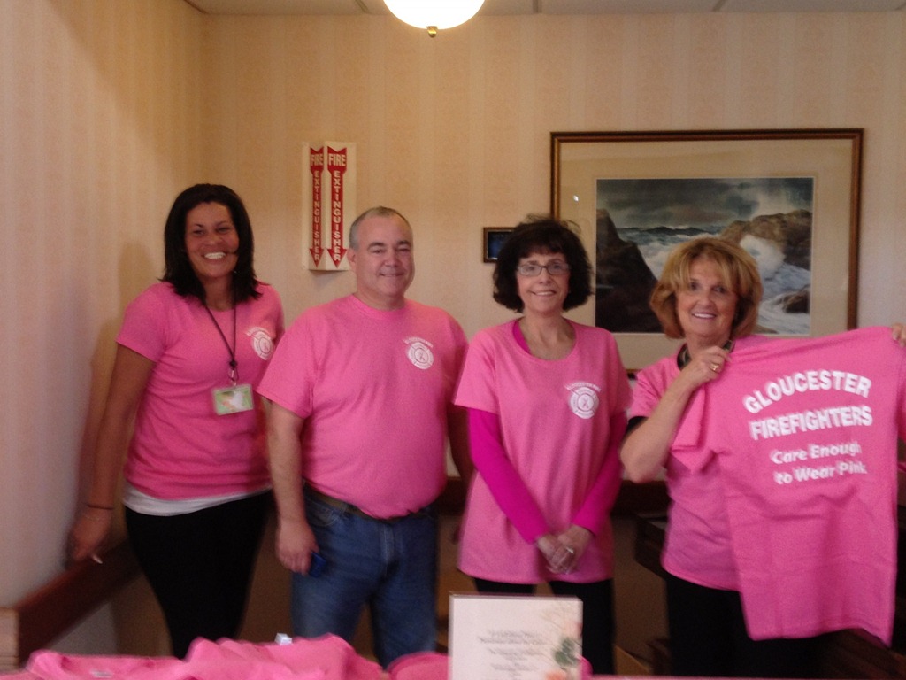 Today Gloucester Fire Fighters sell pink tee shirts for breast cancer awareness at Seacoast Nursing and Rehab Center. All proceeds go directly to cancer research