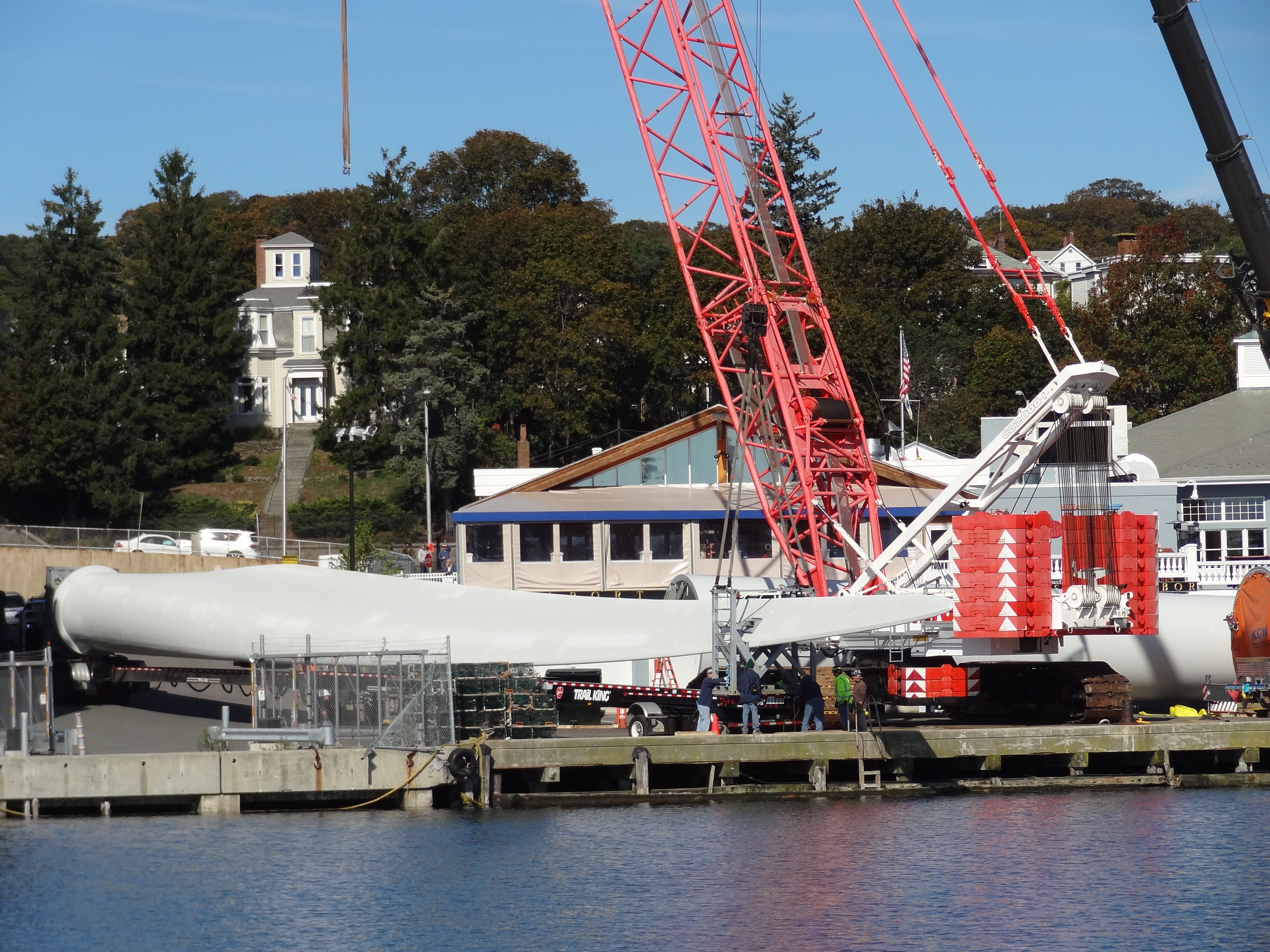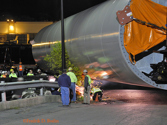 Oops! While moving the largest cylindrical section of the Wind Turbine tower, which was 90 feet long including the truck in front and the rig in the rear, they nearly got hung up leaving Cruiseport. The problem was a steel pylon (painted yellow). No problem for this crew however β they just took a torch to it and cut it down to the ground. The bushes went bye bye too.
