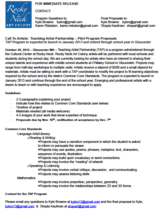 Karen Ristuben, the President of the Rocky Neck Art Colony, asked me to send along this press release announcing the development of and preliminary Call To Artists for the Teaching Artist Partnership Pilot Program that will supplement the arts programs of middle school students. Focused initially on O’Maley School in Gloucester, the program partners TAP coordinators with emerging or professional artists allowing the artists to share their unique talents or experiences with the students.