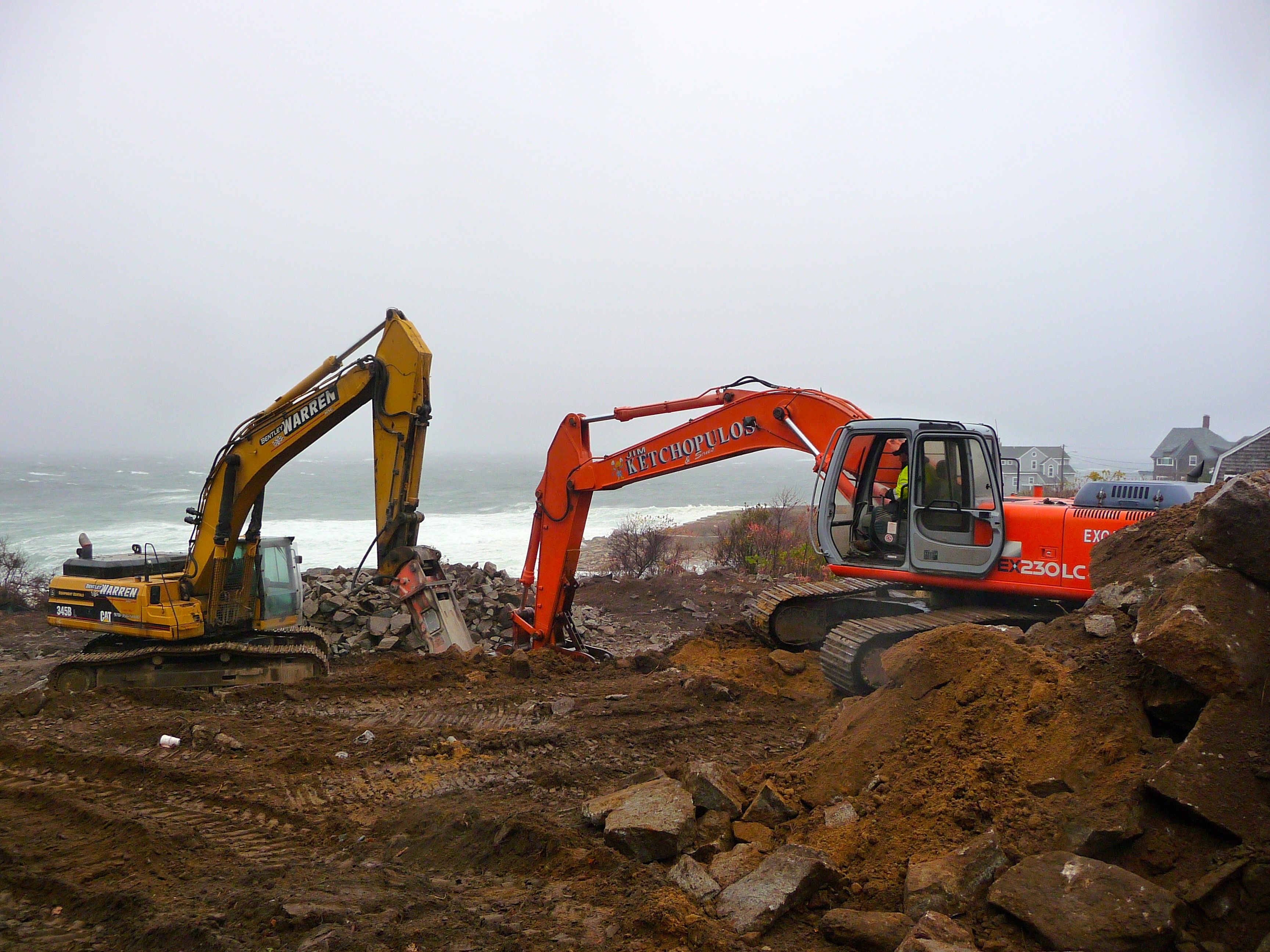 Four hours until landfall of Frankenstorm Sandy and do Jim Ketchopulos & Sons take a day off with 12 foot waves rolling into the property? No way. A basement needs to go into the ledge and a little wind isn’t going to stop them.