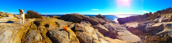 The pano stitching is pretty good. Handheld and turn the phone. The horizon is a tad ragged on the left hand side but the clarity through out is not too shabby. All three lighthouses , couple of boats, a dog and a duck. I over saturated the colors on a lower resolution and I can do a better job with a smooth sweep with practice. If dogs or people move when you are sweeping they can become quite amusing, scary, and mutated.
