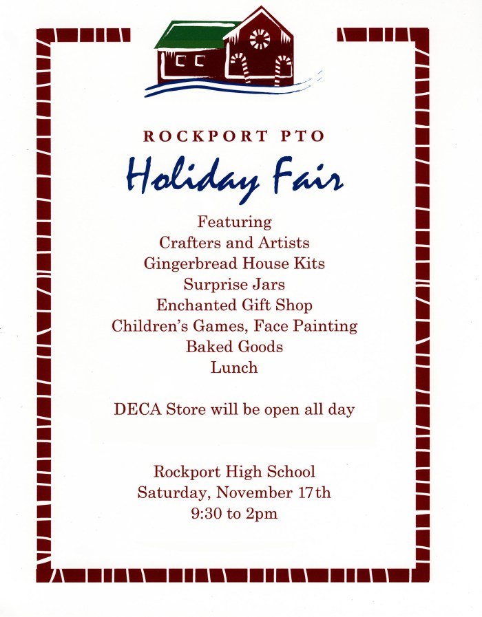 Seems like it was just Labor Day, but here it is, holiday fair time again, and the Rockport PTO Holiday Fair is a good one, so come on by on Saturday, November 17.