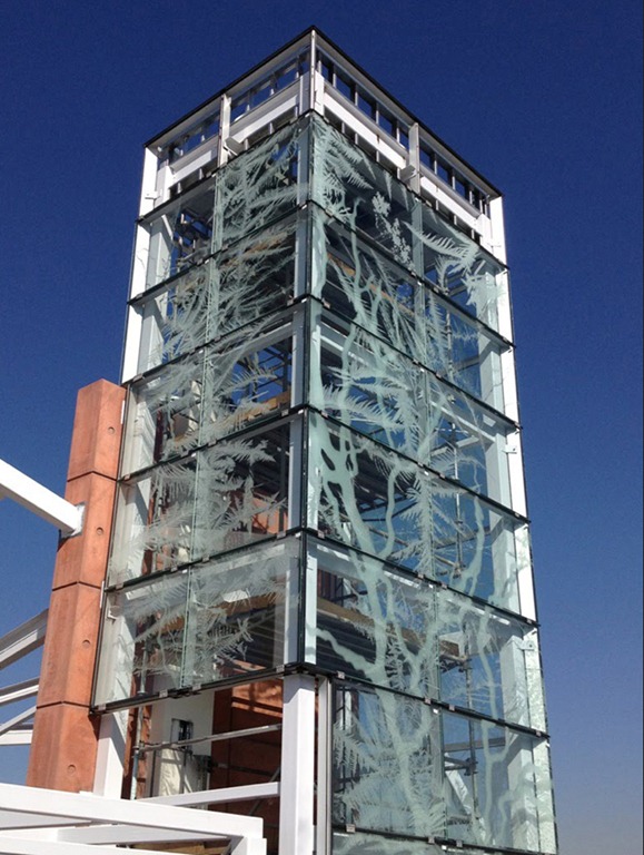 Back in the beginning of the year an architectural designer, Catherine Widgery purchased a lot of my macro photos of ice crystals that she found on my Flickr site, ‘Photoholic1’. She used them, combined with lightning graphics, into large etched-glass windows for a transit station platform, elevator enclosure and stairs in Salt Lake City, Utah which is now under construction. Here’s a few photos of the work being done. -Len Burgess